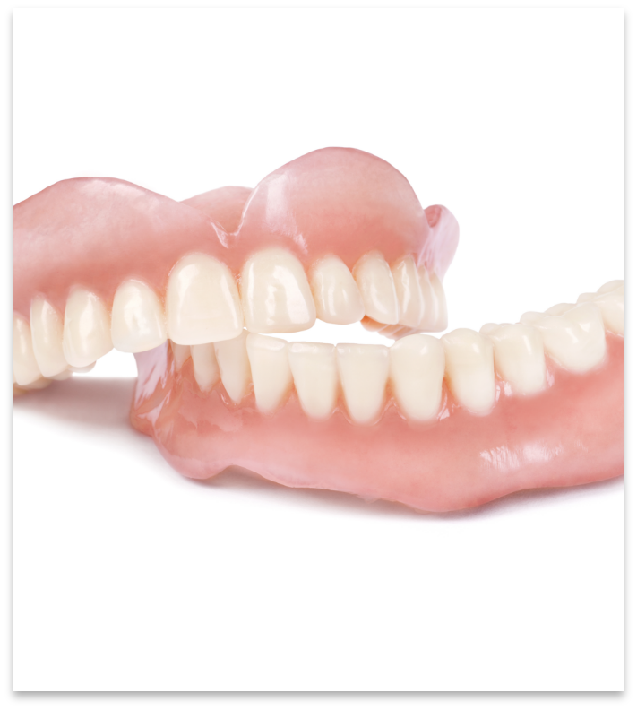 Complete dentures are used when you are missing all of your teeth in either the upper or lower jaw, or both. They consist of a full set of replacement teeth that are attached to a gum-colored acrylic base, which rests on your gums and is held in place by suction or dental adhesive.